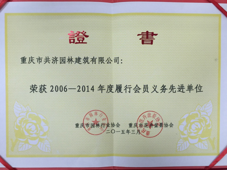 2015年3月25日,在重庆市红楼宾馆召开了重庆市园林行业协会、重庆市花卉盆景协会2014年度事情总结暨表扬大会,我集团旗下重庆市共济园林建筑有限公司荣获了2006-2014年度履行会员义务先进单位。